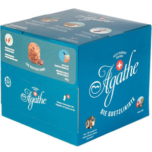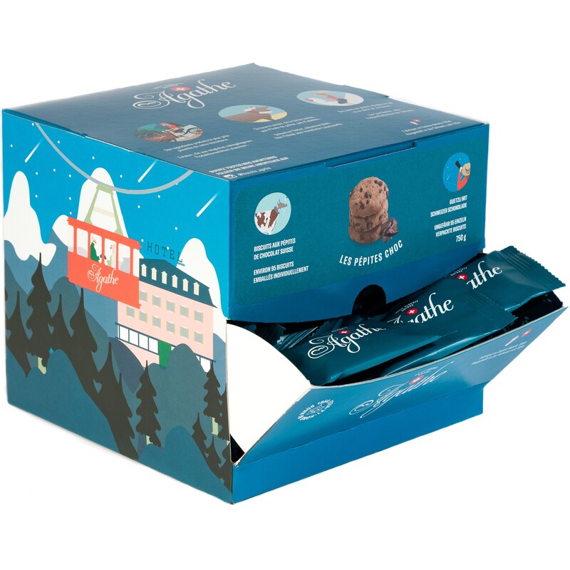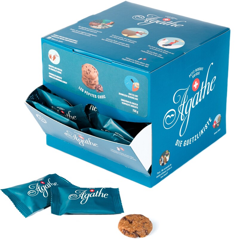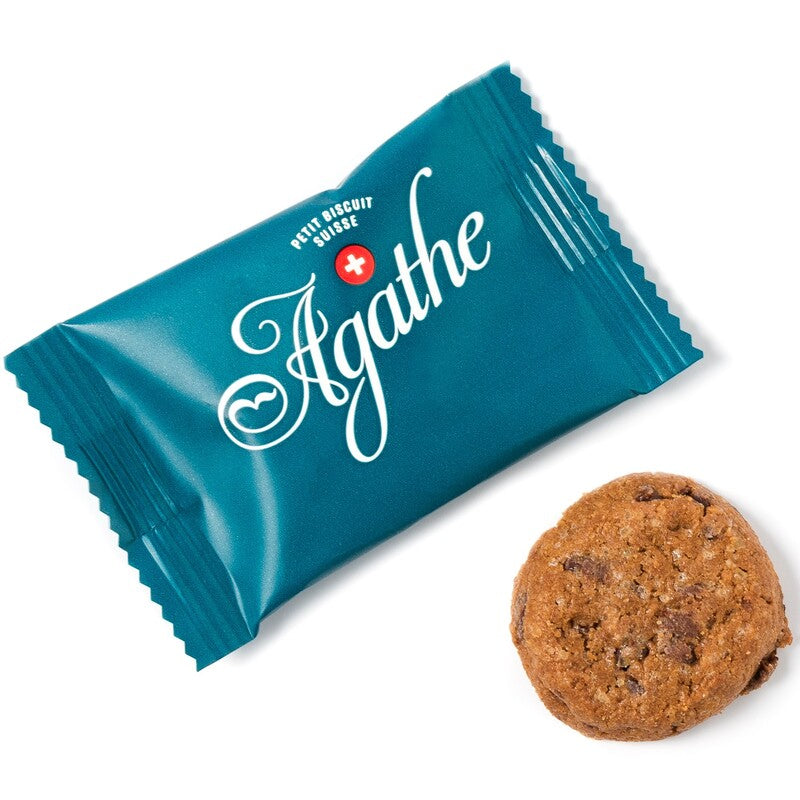 Genießen Sie die Agathe Schoko-Sablés, 750g, 95 Stück, verfeinert mit kleinen Schweizer Bitterschokoladenstückchen. Hergestellt in der Schweiz mit umweltbewusster Zutatenbeschaffung für kurze Transportwege. Individuelle Verpackungs- und Kennzeichnungsoptionen sind auf Anfrage erhältlich. Perfekt als Mitarbeiter-Geschenk. 100% Swissness garantiert!