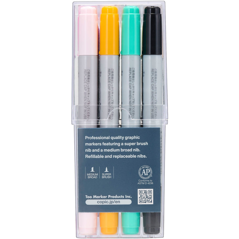 Das Copic Ciao 36er Set A ist die ultimative Kollektion mit weichen, warmen Farben. Es wird empfohlen für Anwender, die die Misch- oder Gradationstechniken verbessern möchten. Die gesamte Palette der 180 Copic Ciao-Farben wird vollständig, wenn man die 36 Sets A, B, C, D und E kombiniert. Beginnen oder erweitern Sie Ihre Sammlung mit zusammengestellten Sets mit Farbkombinationen, die sich zum Mischen eignen. So können Sie professionelle Ergebnisse erzielen. Das Acryl Display sorgt dafür, dass die Marker gut geordnet und für eine einfache Orientierung sichtbar sind. Hiermit wird die Planung der perfekten Mischungen und Farbschemata erleichtert. Copic Ciao ist der ideale Grafik-Einstiegsmarker, der mit alkohol- und farbstoffbasierter Tinte in professioneller Qualität hergestellt wird. Die in der Ciao-Reihe erhältlichen Farbtöne lassen sich besonders leicht layern und verblenden, was sie ideal für Anfänger und Schüler macht. Zusätzlich sind die Endkappen durch Luftschlitze kindersicher bei möglichem Verschlucken. Das doppelseitige Design zeichnet sich durch eine superflexible Spitze sowie eine mittelbreite Spitze für ausdrucksstarke Striche, Tonaufbau, Farbmischungen, Schattierungen, feinere Details, Linien sowie eine grosse, streifenfreie Deckkraft aus. Die Ciao Grafikmarker sind nachfüllbar, mit austauschbaren Spitzen, ultra-mischbar und mit der höchsten Qualität hergestellt. Enthaltene Farben: C1 (Cool Gray No. 1), C5 (Cool Gray No. 5), C7 (Cool Gray No. 7), 0 (Colourless Blender), B05 (Process Blue), B23 (Phthalo Blue), B32 (Pale Blue), B39 (Prussian Blue), BG10 (Cool Shadow), BG15 (Aqua), BG93 (Green Gray), BV04 (Blueberry), E02 (Fruit Pink), E04 (Lipstick Natural), E08 (Brown), E33 (Sand), E35 (Chamois), E47 (Dark Brown), E51 (Milky White), G02 (Spectrum Green), G21 (Lime Green), G99 (Olive), R02 (Rose Salmon), R27 (Cadmium Red), R59 (Cardinal), RV21 (Light Pink), RV23 (Pure Pink), RV29 (Crimson), RV42 (Salmon Pink), V17 (Amethyst), Y02 (Canary Yellow), Y08 (Acid Yellow), YG41 (Pale Cobalt Green), YG67 (Moss), YR00 (Powder Pink), YR04 (Chrome Orange).