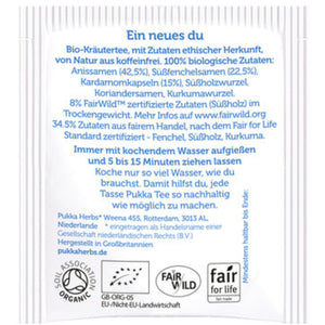Jeder Pukka Bio-Teebeutel ist komplett plastikfrei und wird in einer eigenen recycelbaren Hülle geliefert, um die ätherische Öle unserer Bio-Kräuter zu erhalten. Jeder Teebeutel hat zwei Kammern, in denen sich diese unglaublichen Kräuter befinden und in denen die Kräuterpower in deine Tasse entweichen kann. Damit sich die Aromen vollständig entfalten können, gieße kochendes Wasser direkt auf den Beutel. Jede Pflanze liebt das Wasser, also lasse deinen Tee für den perfekten Genussmoment ausreichend ziehen. Und denke daran, nur die Wassermenge zu kochen, die du benötigst, um deinen Tee so umweltfreundlich wie möglich zu machen.