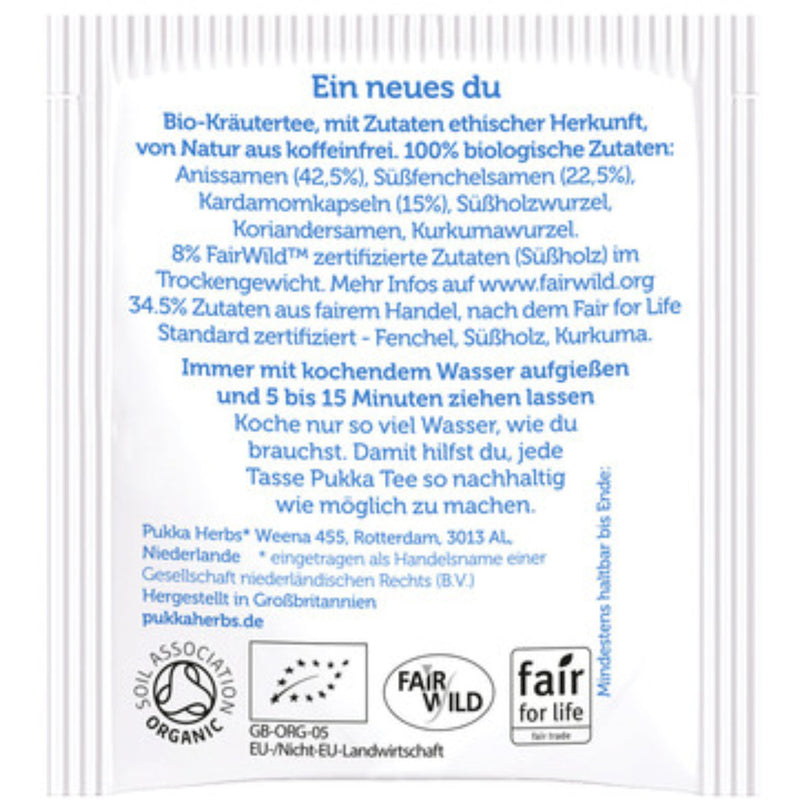Ein Tässchen Bio-Genuss, für einen frischen Start, sanft aber bestimmt. Lasse dich von der Süße des Fenchelsamens durchdringen und von Anis und üppigem Kardamom dazu verführen, Altes abzulegen und dich neu zu erfinden. Ein Genuss auch nach dem Essen, für die kleine Portion Verwandlung im Alltag. Bio-Kräutertee, mit 100% biologischen Zutaten ethischer Herkunft, von Natur aus koffeinfrei.