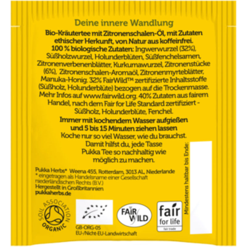 Inspiriert von einem Rezept, das seit Generationen Behaglichkeit und Wohlgefühl spendet. Komme herein und mach es dir gemütlich, bei sonnengereifter Zitrone, schonend-getrockneter Ingwerwurzel und zarter FairWild™-Holunderblüte. Bist du aufgetaut? Dann wirst du gleich den samtigen Manuka-Honig-Kuss spüren! Bio-Kräutertee mit Zitronenschalen-Öl, mit 100% biologischen Zutaten ethischer Herkunft, von Natur aus koffeinfrei.
